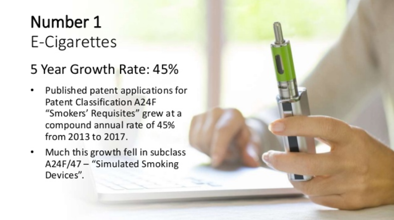 ¿Sabéis cuál es la categoría tecnológica que ha registrado el año pasado, 2017, un mayor incremento en términos porcentuales en el número de patentes solicitadas? Yo habría apostado por la inteligencia artificial, el aprendizaje automático, los drones, la impresión en 3D. ¡ARRRR!. Error. La categoría que ha crecido más, el número uno, es el cigarrillo electrónico.