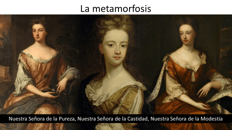 Virginia se detiene en una poética y fantasiosa descripción de la metamorfosis en la que aparecen tres conceptos abstractos como personajes, los espíritus de our Lady of Purity (Nuestra Señora de la Pureza), our Lady of Chastity (Nuestra Señora de la Castidad) y our Lady of Modesty (Nuestra Señora de la Modestia), que representan los valores que más se apreciaban en una mujer de la época. No es el único momento de la narración en el que Virginia se refiere y personifica conceptos abstractos, identificándolos con mayúsculas, como nombres propios.