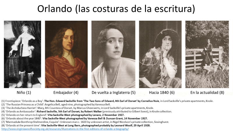 Virginia dedica la obra, efectivamente, a Vita y algunas de las “supuestas” fotos de Orlando que aparecen en la edición original y que se reproducen en la edición de Alianza Editorial son de la propia Vita y de algunos de sus ilustres antepasados. Sin embargo, ella no aparece en ningún momento en la obra como personaje ni como referencia, y nadie que no conozca la historia personal de Virginia Woolf podría descubrir jamás a Vita solo a través de la lectura de Orlando. No tengo ninguna duda de que biógrafos y críticos han hecho su trabajo y han buceado en lo que Virginia quiso escribir, Orlando como un homenaje a su amante y amiga. Pero no veo ninguna diferencia, más que táctica u oportunista, al destacar a Vita como elemento central o nuclear de la obra, porque es evidente que similares fuentes de inspiración, hombres, mujeres, circunstancias históricas y personales, son siempre la fuente de inspiración y la materia de la que está hecha toda obra literaria, como por otra parte, Virginia deja claro en el prólogo: