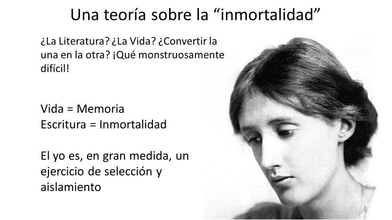 Mientras está en esta reflexión, Virginia introduce otro ingrediente esencial: la memoria. Su relación con la creación, la vida, y la historia que se desarrolla a continuación es, en gran medida evidente, pero creo que nunca lo había encontrado desarrollado de una manera tan detallada, tan explícita y central como en esta obra. Virginia consigue establecer una identidad entre la vida, la memoria, la literatura y la búsqueda de trascendencia: la inmortalidad. En ciencia ficción, esto sería un auténtico novum.