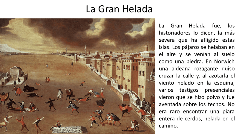 La Gran Helada fue, los historiadores lo dicen, la más severa que ha afligido estas islas. Los pájaros se helaban en el aire y se venían al suelo como una piedra. En Norwich una aldeana rozagante quiso cruzar la calle y, al azotarla el viento helado en la esquina, varios testigos presenciales vieron que se hizo polvo y fue aventada sobre los techos. La mortandad de rebaños y de ganados fue enorme. Se congelaban los cadáveres y no los podían arrancar de las sábanas. No era raro encontrar una piara entera de cerdos, helada en el camino. Los campos estaban llenos de pastores, labradores, yuntas de caballos y muchachos reducidos a espantapájaros paralizados en un acto preciso, uno con los dedos en la nariz, otro con la botella en los labios, un tercero con una piedra levantada para arrojarla a un cuervo que estaba como disecado en un cerco. Era tan extraordinario el rigor de la helada que a veces ocurría una especie de petrificación; y era general suponer que el notable aumento de rocas en determinados puntos de Derbyshire se debía, no a una erupción (porque no la hubo), sino a la solidificación de viandantes infortunados que habían sido convertidos literalmente en piedra. La Iglesia pudo prestar poca ayuda, y aunque algunos propietarios hicieron bendecir esas reliquias, la mayoría las habilitó para mojones, postes para rascarse las ovejas, o, cuando la forma de la piedra lo permitía, bebederos para las vacas, empleo que desempeñan, en general admirablemente, hasta el día de hoy.