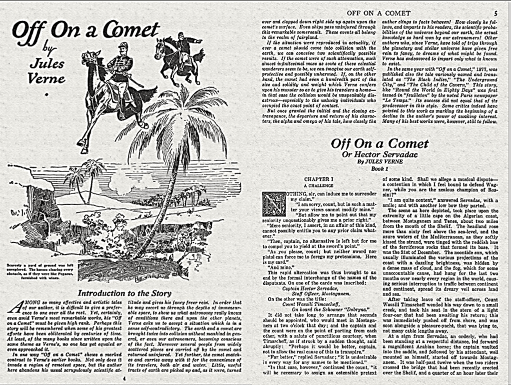 Para ese primer número inaugural, Hugo Gernsback escogió Hector Servadac: voyages et aventures à travers le monde solaire (Off On a Comet, en inglés):