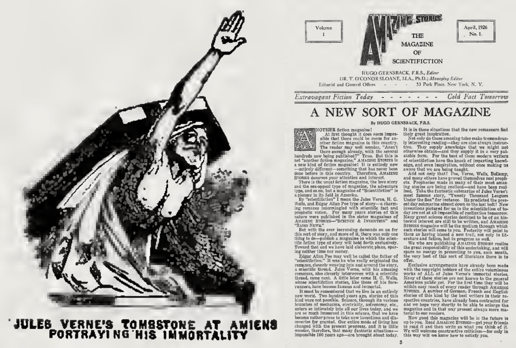 En abril de 1926, Hugo Gernsback hacía una llamada con el lanzamiento de la revista Amazing Stories, a favor del tipo de historia de Edgar Allan Poe, Julio Verne y H. G. Wells, —con la que los convertía de facto14 en escritores de cientificción o ¡ciencia ficción!—: