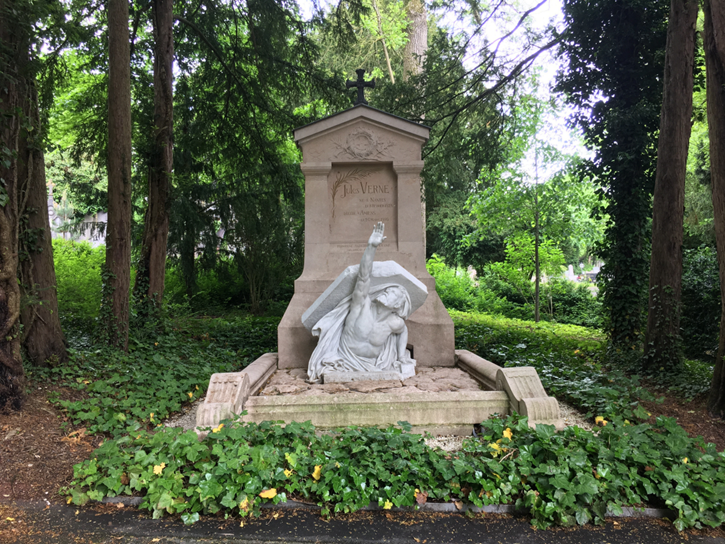 Julio Verne murió en Amiens, Francia, en 1905. Dos años más tarde, en su tumba se exhibía una escultura espectacular de un hombre que se abre paso a empujones para salir de la tierra y alcanzar los cielos. La escultura se titula Vers l’immortalité et l’éternelle jeunesse (Hacia la inmortalidad y la eterna juventud).