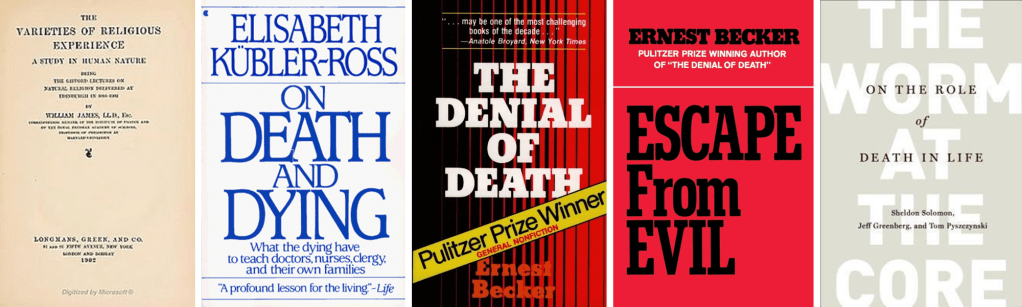 De manera no demasiado sorprendente (como argumento a continuación), mi breve post recoge con extraordinaria sencillez y frivolidad algunos de los argumentos que exploran en detalle autores y obras que yo entonces no conocía. En aquel momento yo no tenía ni la menor idea de quién había sido Ernest Becker, ni conocía su obra The Denial of Death (1973)1. Las cinco etapas del duelo seguramente estaban ya en mi radar, pero no hubiera sido capaz de ubicarlas en la obra de Elisabeth Kubler-Ross On Death and Dying (1969)2. No conocía los trabajos de Sheldon Solomon, Jeff Greenberg, and Tom Pyszczynski, y de hecho su obra The Worm at the Core: On the Role of Death in Life (2015)3 todavía no había sido publicada.